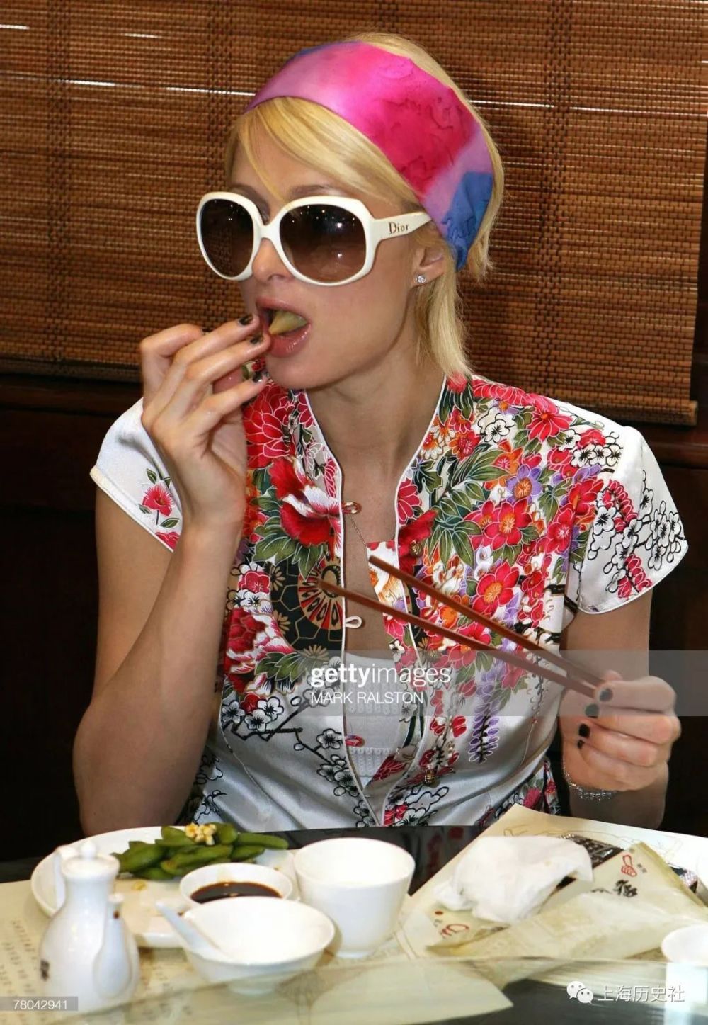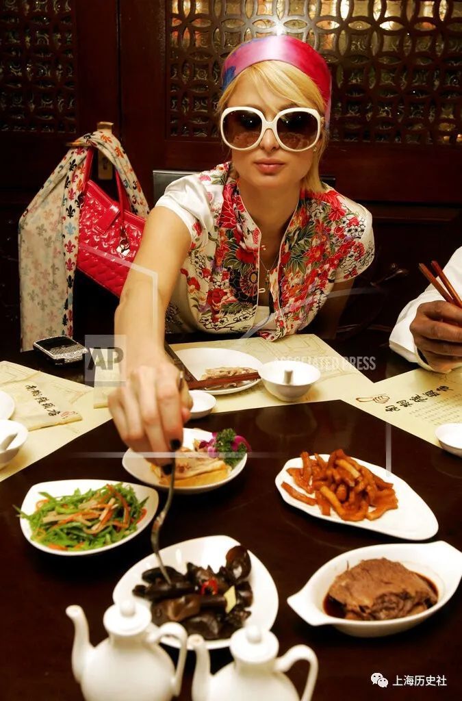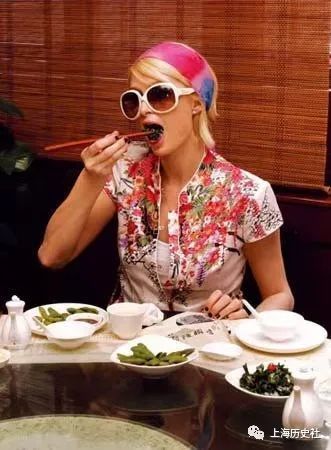 图24-27:希尔顿在南翔馒头店的长兴厅里,品尝水煮毛豆、菜心和豆腐蟹黄春卷等冷盆菜。看得出她使用筷子的技巧还可以,不过吃饭还不忘戴着她的 DIOR 墨镜,有点故意“拗造型”或是“犹抱琵琶半遮面”的感觉。