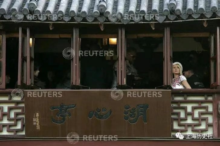 图43-46:帕丽斯·希尔顿随后登上湖心亭茶楼二楼的宛在轩品茶。还不忘向下俯瞰九曲桥上的人群。