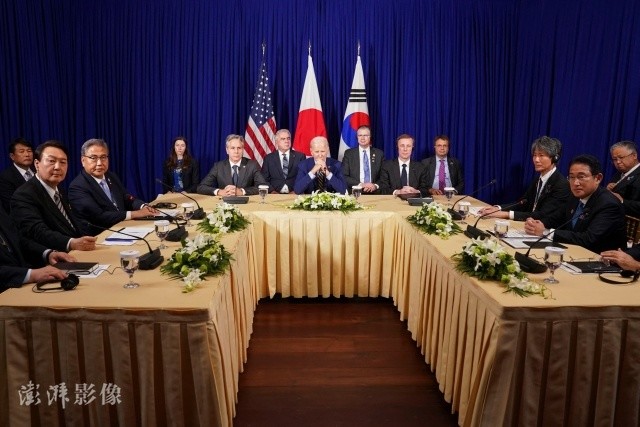 2022年11月13日,柬埔寨金边,美国总统拜登、日本首相岸田文雄和韩国总统尹锡悦在东盟峰会期间举行美日韩三边首脑会谈。图自澎湃影像