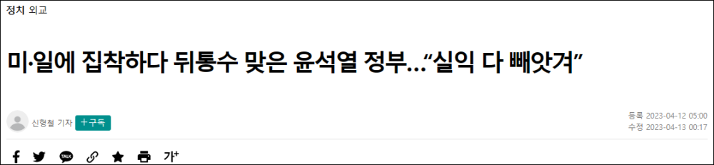 《民族日报》指出,日本政府的态度与韩国总统尹锡悦的预测相悖。上月21日,尹锡悦在韩日首脑会谈五天后举行的国务会议上曾表示,韩日关系不是一方多得,另一方就会失去更多的零和关系,若韩国能够率先扫除绊脚石,日本肯定也会作出回应。