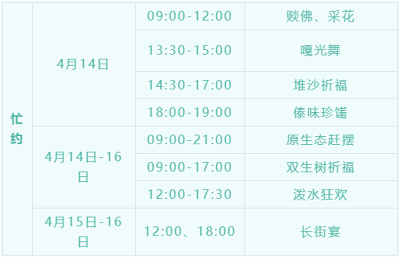 内 容:竖“赏建”、祈福活动、嘎伴光联欢、泼水狂欢