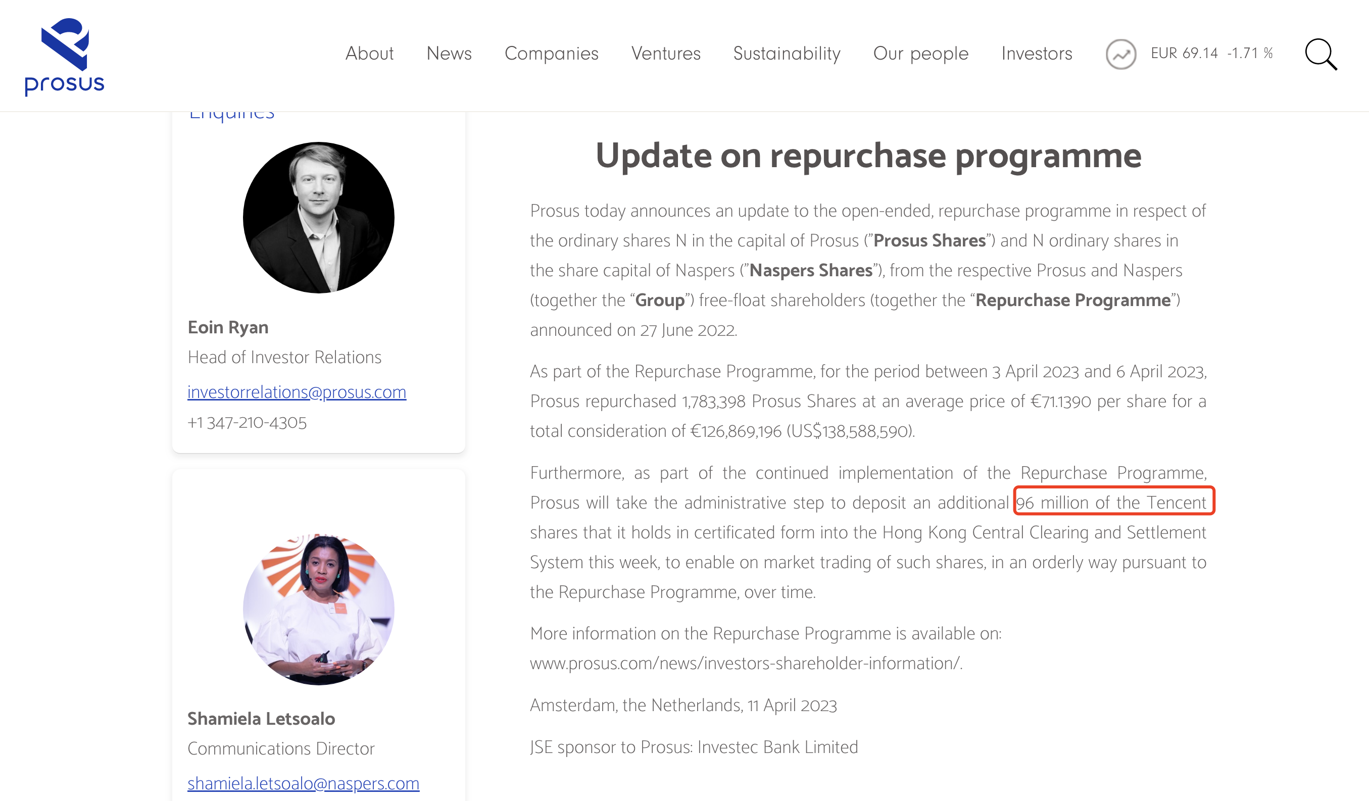 据财联社,腾讯大股东Prosus周二发布公告称,作为继续实施其股票回购计划的一部分,Prosus本周将采取行政措施,将其持有的额外9,600万股腾讯股票以凭证形式存入香港中央结算系统,从而实现随着时间的推移,根据回购计划有序地进行腾讯股票的市场交易。这也意味着,Prosus将继续减持腾讯股票筹资,来实现回购自己公司股票的计划。