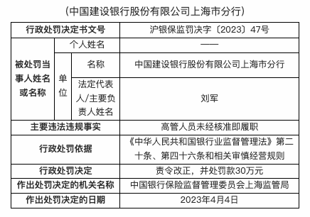 据界面,4月12日,上海银保监局行政处罚信息公开表显示,2023年4月4日,中国建设银行股份有限公司上海市分行因高管人员未经核准即履职,被责令改正,并处罚款30万元。