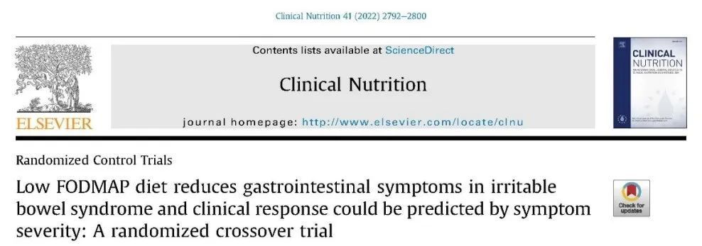 Algera JP, Demir D, T?rnblom H, Nybacka S, Simrén M, St?rsrud S. Low FODMAP diet reduces gastrointestinal symptoms in irritable bowel syndrome and clinical response could be predicted by symptom severity: A randomized crossover trial. Clin Nutr. 2022 Dec;41(12):2792-2800. doi: 10.1016/j.clnu.2022.11.001IF: 7.643 Q1 . Epub 2022 Nov 4. PMID: 36384081.