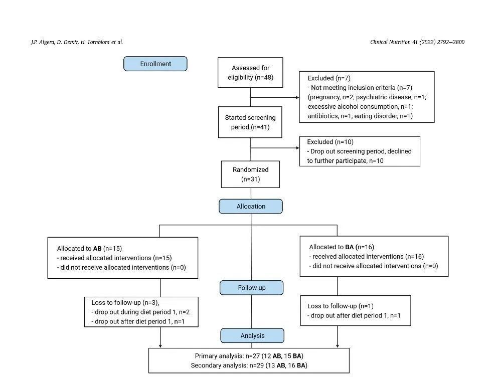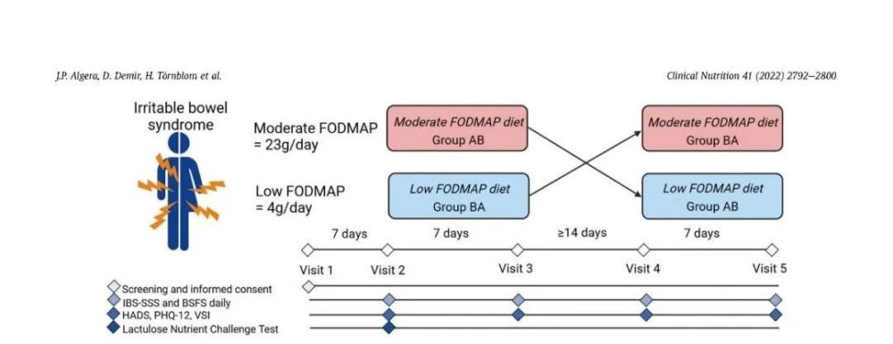 该研究为一项双盲、随机、对照、交叉的临床研究,通过对比低FODMAP饮食干预和中FODMAP饮食干预对IBS症状、精神心理以及生活质量的影响,并明确相关预测因素。