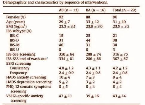 研究启动后,共47例患者接受入组筛选,31例患者进入至随机分组接受饮食干预阶段。研究结束时共27例患者完成两个阶段的饮食干预,2例患者仅完成第一阶段饮食干预,2例患者因其他与本研究无关的原因退出研究。最终进行统计分析时,将至少完成一个阶段饮食干预的患者资料纳入分析。最终共29例患者数据资料纳入研究,其中IBS-SSS评分为中度和重度的人数分别为12例和17例。对于精神心理状况,16例患者焦虑评分异常,2例患者抑郁评分异常。