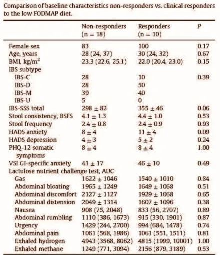 评价FODMAP饮食的反应性:低FODMAP饮食后,IBS-SSS评分降低≥50,则认为具有临床反应,并将患者分为FODMAP反应者和FODMAP无反应者。