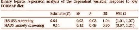 通过对比FODMAP饮食反应者和无反应者,可以发现包括乳果糖营养吸收检测在内的临床之间均没有显著差异。然而,与FODMAP饮食无反应者相比,FODMAP反应者在干预开始前具有更加严重的消化道症状和焦虑状态。经logistic回归分析发现,IBS-SSS评分对预测FODMAP饮食干预的临床反应更重要。