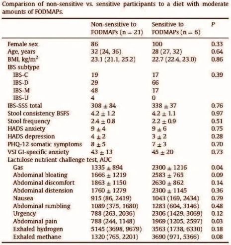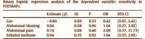 通过对比FODMAP敏感者和不敏感者的资料发现,在乳果糖营养吸收检测中,与不敏感的参与者相比,FODMAP敏感者腹胀或腹痛程度更重,呼出气体的甲烷浓度更高。然而,logistic回归分析并未发现相关的预测因子。