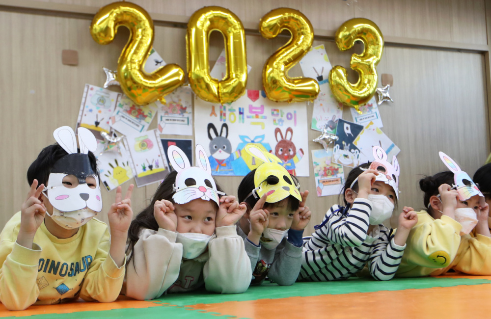 当地时间2022年12月29日,韩国光州,辞旧迎新之际,一家幼儿园里的儿童戴着兔子面具,玩游戏迎新年。(IC photo)