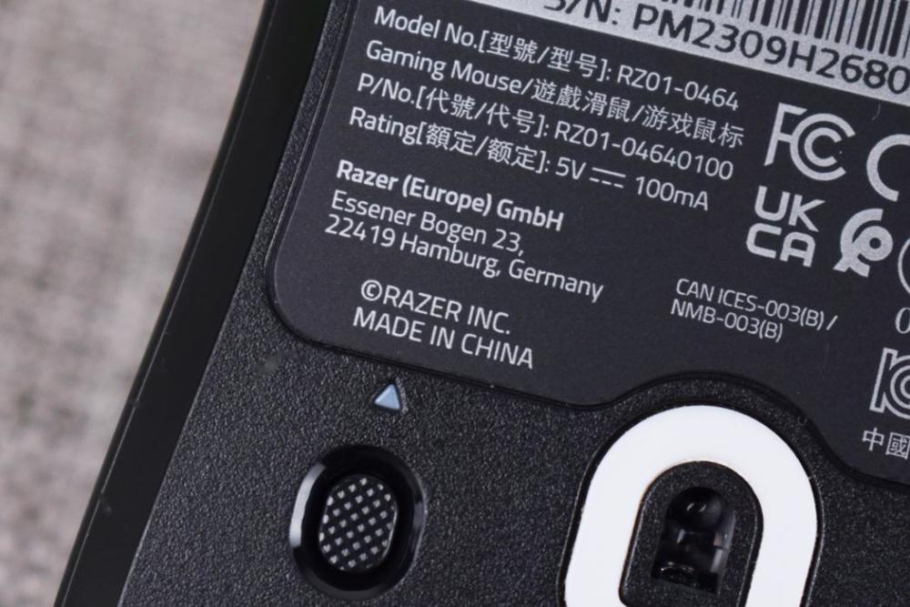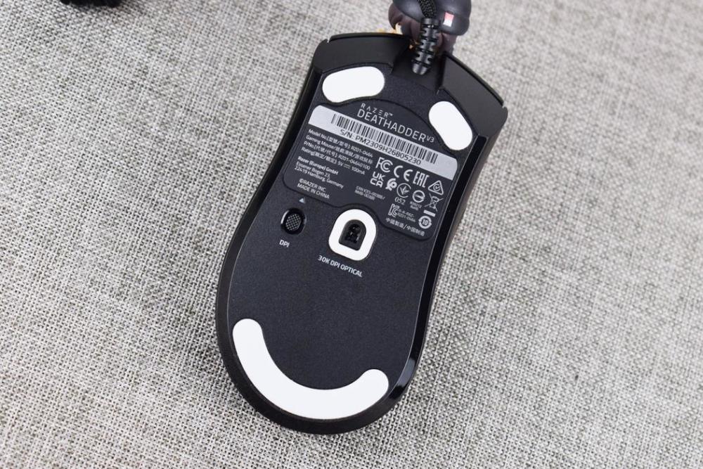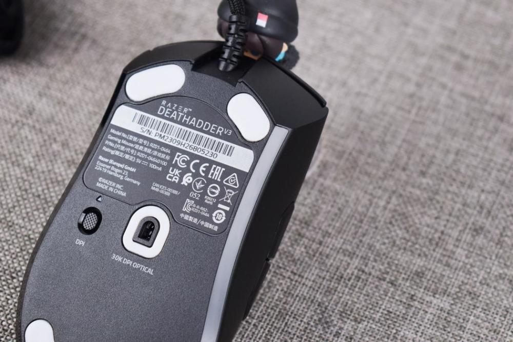 来到鼠标底部,在光学引擎方面,炼狱蝰蛇V3采用雷蛇FOCUS PRO 30K光学传感器,最大DPI可达3W,并拥有8K刷新率特性,鼠标本身板载储存并支持5组自定义设定档,在设定完毕后即可卸载驱动,轻松做到免驱;在底部脚垫方面,炼狱蝰蛇V3使用了100%的PTFE脚垫,标称厚度约为0.8毫米,实际表现相当顺滑。