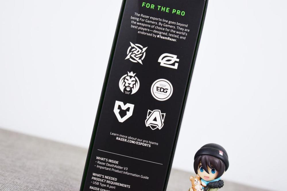 雷蛇炼狱蝰蛇V3有线游戏鼠标(下文简称“炼狱蝰蛇V3”)在包装风格上和传统雷蛇产品保持一致,黑+荧光绿配色相当醒目,而包装信息一如既往的简洁,从包装信息上我们可以看到,炼狱蝰蛇V3主要特点在于其轻量化机身重量以及面向电竞的专业定位。
