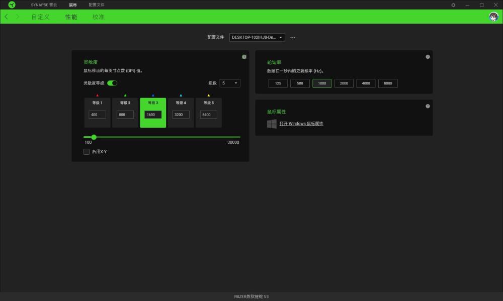 而在性能设定上,炼狱蝰蛇V3和之前的毒蝰8K有点类似,除了支持五组100~30000DPI设定外,刷新率方面则可以设定为