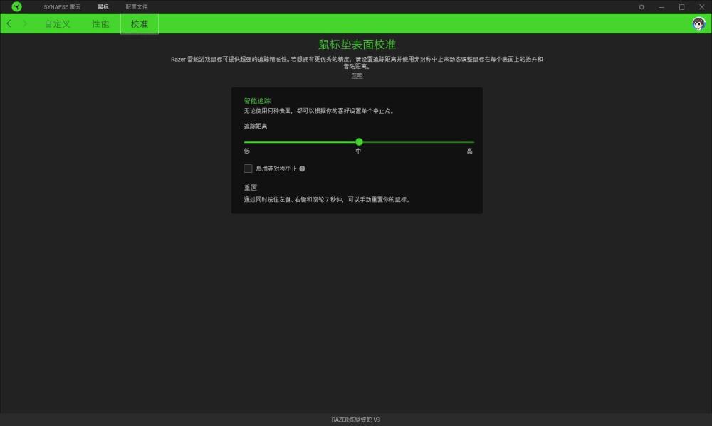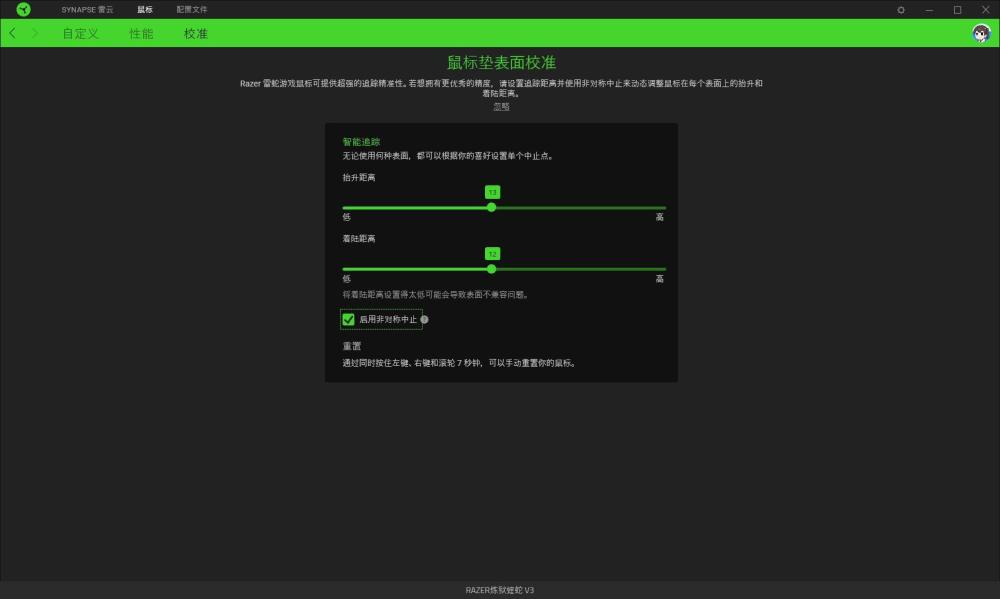 鼠标表面校准方面,炼狱蝰蛇V3默认支持对LOD进行高中低3种调整,在开启雷蛇的非对称中止设定后,玩家可以分别调整抬升距离和着陆距离,适合那些对手感反应有要求的进阶电竞玩家。