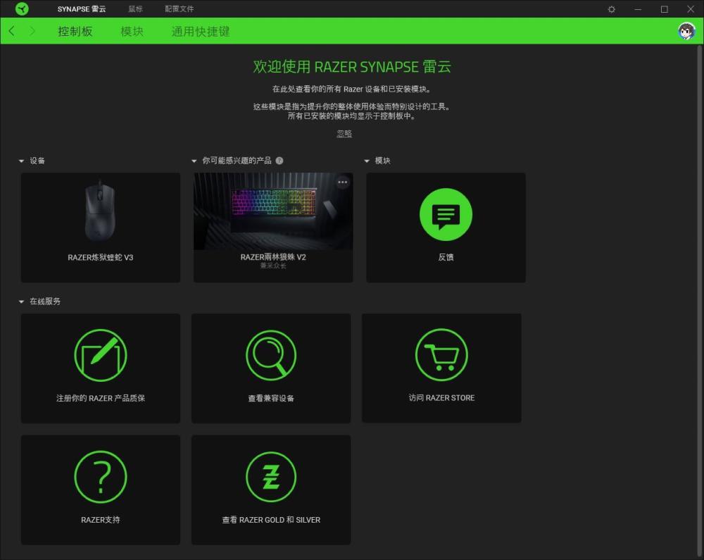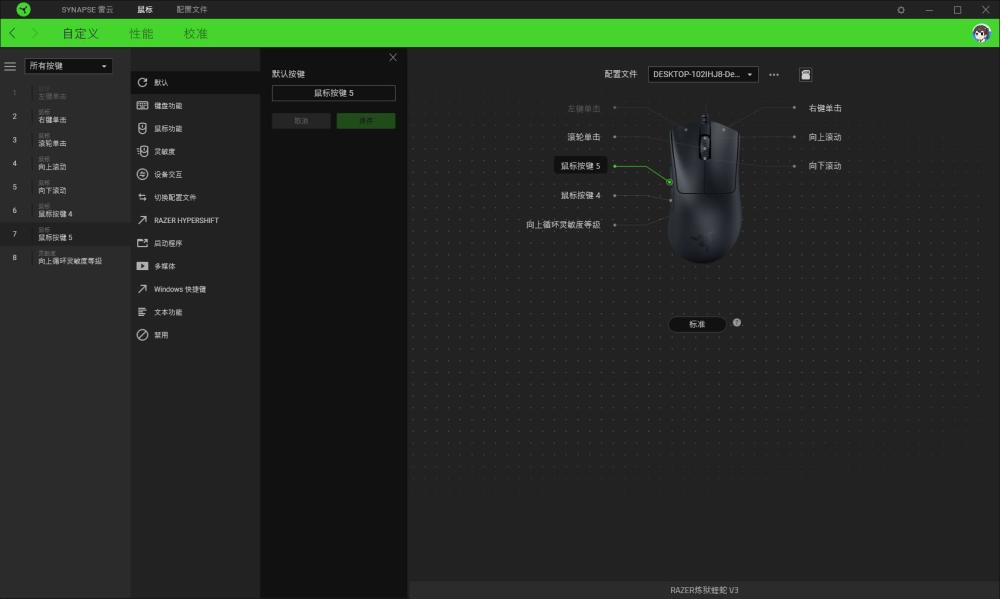 和之前雷蛇产品一样,炼狱蝰蛇V3的驱动也是雷云3,玩家通过官网下载安装即可,在设置界面中,我们可以看到包含按键自定义设定、DPI/刷新率设定以及鼠标垫表面校准。