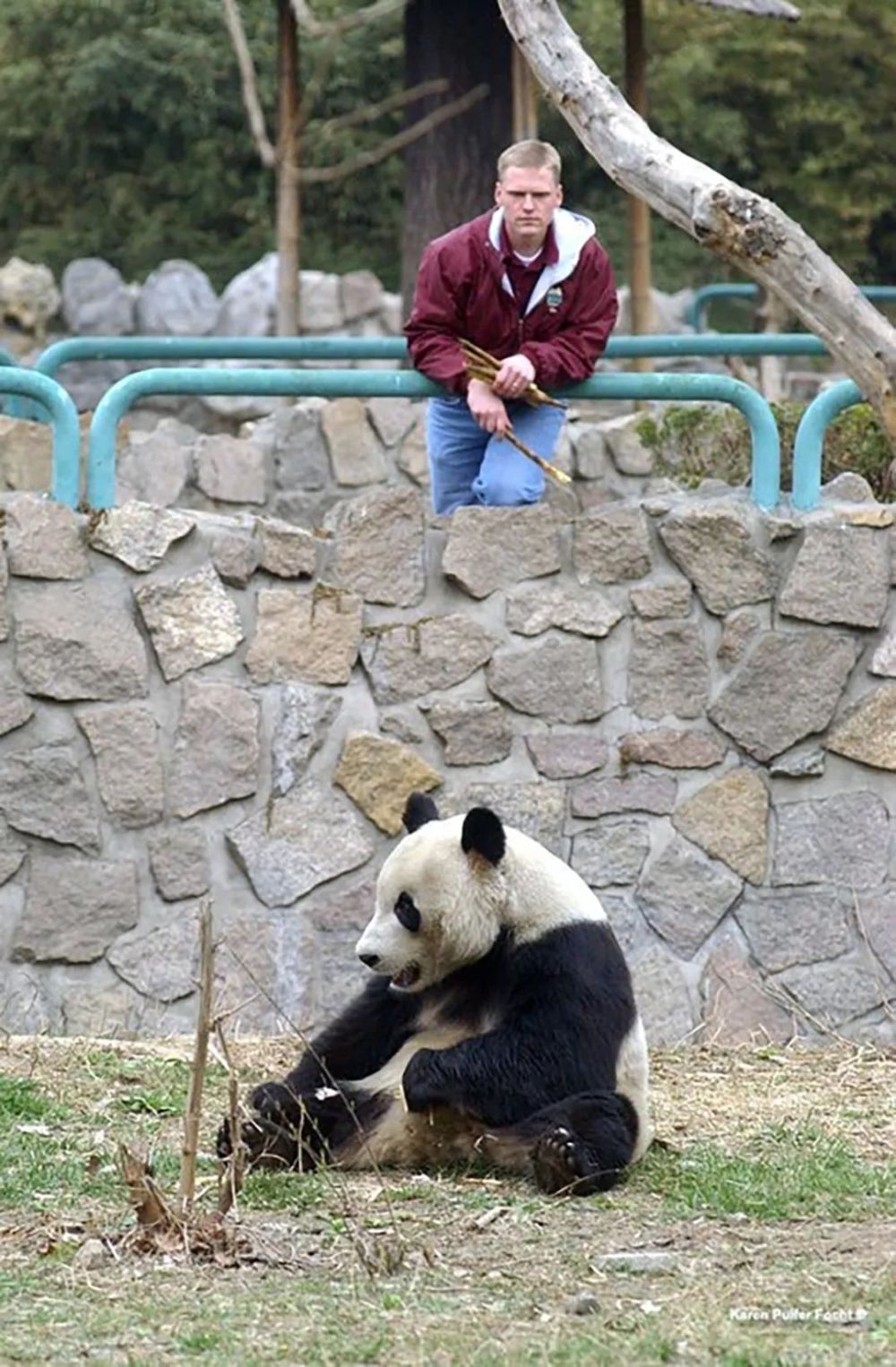 2003年,北京动物园,马特·汤普森隔着围栏看大熊猫。现任孟菲斯动物园总裁兼首席执行官的马特·汤普森,曾是孟菲斯动物园2003年赴中迎接大熊猫们的成员之一。当年,他在抵达中国后,便对大熊猫展现出了浓浓的喜爱。Karen Pulfer Focht 摄