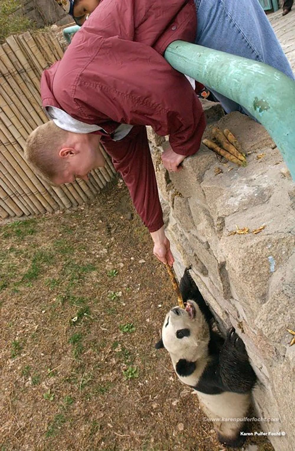 2003年,北京动物园,马特·汤普森喂大熊猫吃竹笋。Karen Pulfer Focht 摄