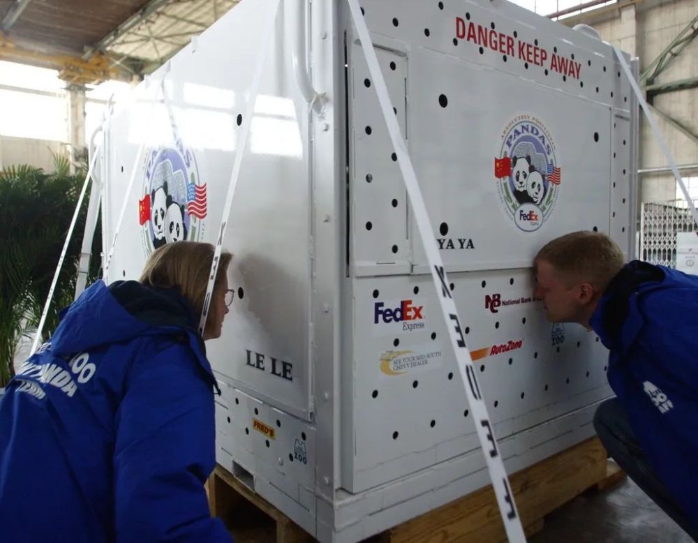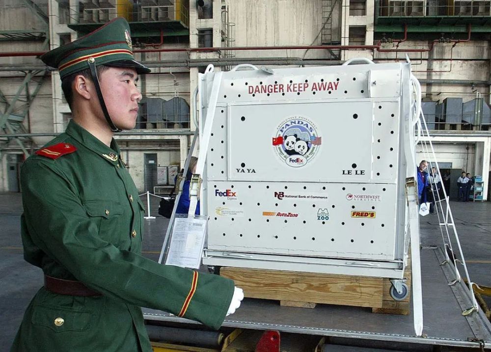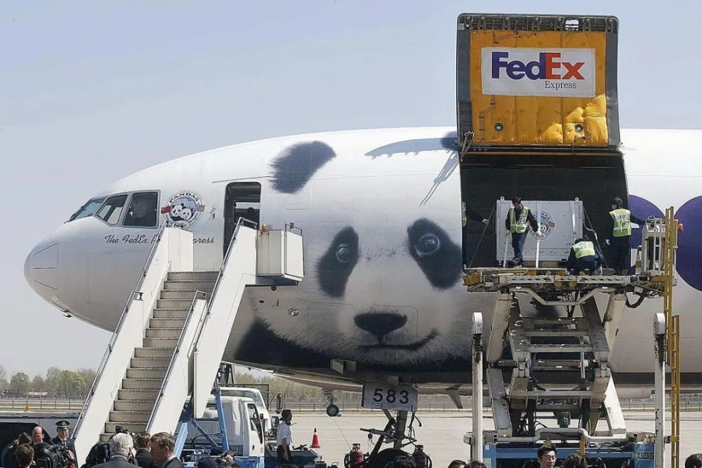 2003年4月7日,北京,大熊猫“丫丫”与“乐乐”被装上联邦快递熊猫快运,准备跨越太平洋飞往美国。