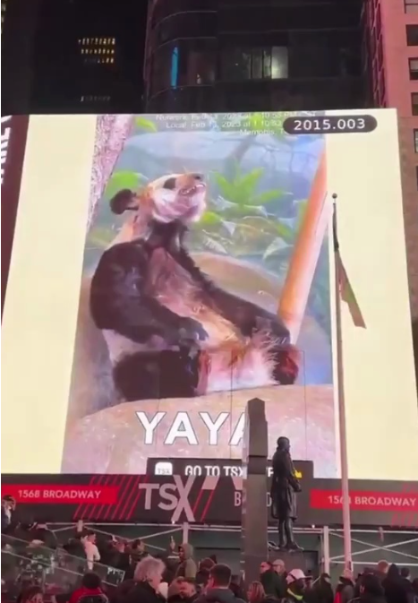 当地时间2023年2月26日,美国,中国网友在纽约时代广场大屏幕为旅美大熊猫“丫丫”和“乐乐”投屏,呼吁人们关注中国旅美大熊猫现状。视频截图(视频来源 @金虎Panda Jinhu(00:13))