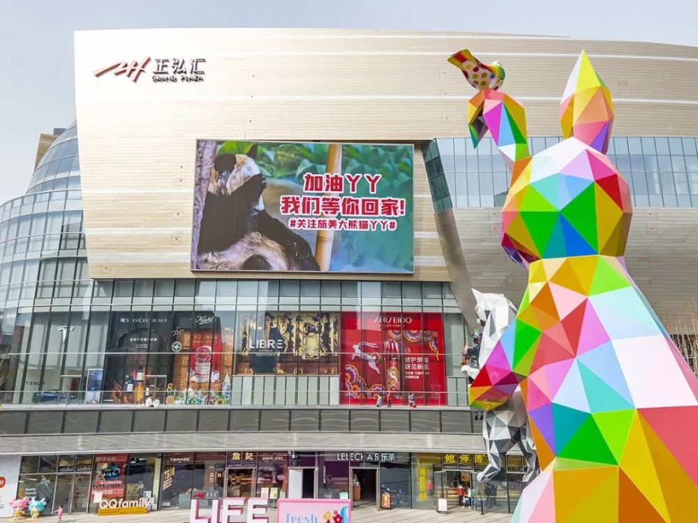 2023年3月11日,郑州,市中心一商场外现巨屏大熊猫“丫丫”海报。