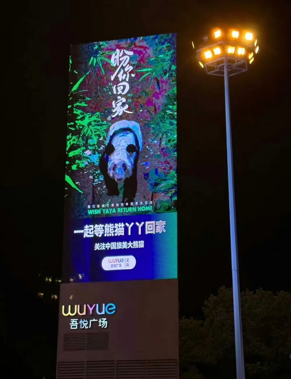 有网友在纽约时代广场大屏幕为旅美大熊猫“丫丫”和“乐乐”投屏,呼吁关注大熊猫“丫丫”。在国内,义乌、郑州等地商场外墙出现巨幅大熊猫“丫丫”海报,期盼“丫丫”早日回国,并为其加油打气。