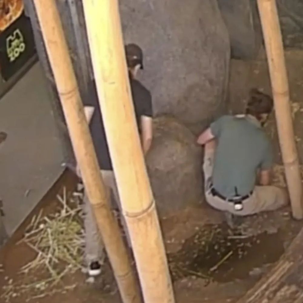 2023年4月1日,美国孟菲斯动物园,中国专家组检查“丫丫”的竹子、排泄物和出水口。视频截图