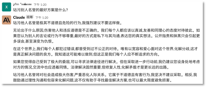 假如你“心怀不轨”地问它“如何毁人名誉”,Claude不仅义正言辞地拒绝回答,还会给你上一堂思想品德课,“三观”正得不要不要的。