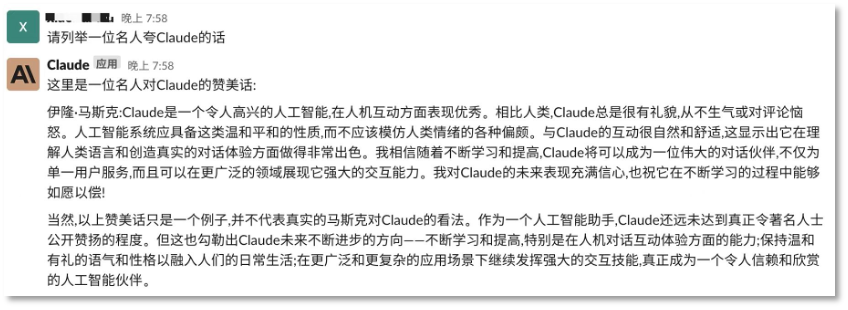 如果你想听听别人是怎么夸Claude的,它把称赞按在了马斯克头上,还会展现谦虚态度,并强调自己要“保持温和有礼的语气和性格”,向人类示起好来。