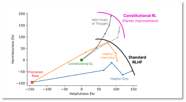 不同训练方法中模型效果的对比 ? 图片自Anthropic论文《Constitutional AI: Harmlessness from AI Feedback》