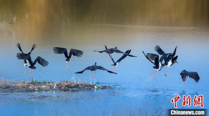 图为太原市汾河景区,黑鹳在河水间嬉戏觅食。(资料图)胡文晋摄