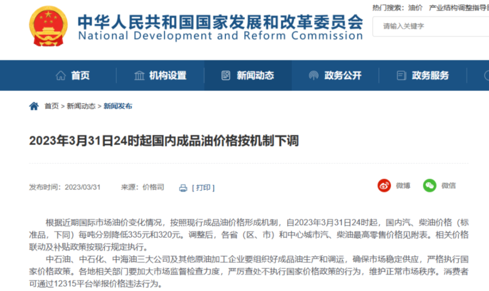 3月31日,国家发改委公告称,自当日24时起,国内汽、柴油价格每吨分别降低335元和320元,折合92号汽油全国平均每升下调0.26元,95号汽油每升下调0.28元。