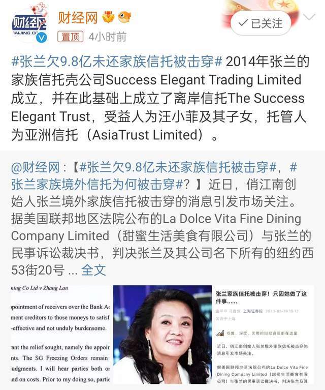 感情不如意,事业也受阻。张兰的海外家族信托被击穿,被爆欠CVC9.8亿。