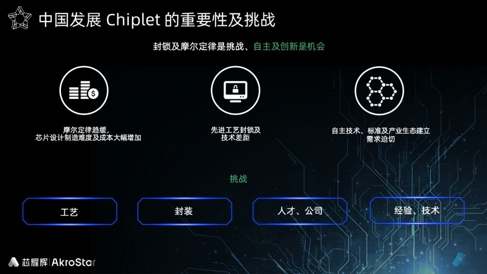 曾克强还特别谈到,除了上述全球通行的产业逻辑,在我国当前面临的特殊环境下,Chiplet也有着特殊重要性:“现在产业链的发展在目前国际形势下,的确是受到国际上的制约,这个带来最大的挑战是封锁,但是最大的机会恰恰也是来自于封锁所带来的迫切的自主需求。因为封锁的问题,我们其实很难像以前那样很方便地得到先进制程代工,但这也很巧合的与Chiplet技术出现的原因类似,我们单靠工艺微缩道路走不下去了,在单位硅片面积上增加晶体管数量有困难,转而需要追求在单个封装内部持续提升晶体管数,这也是目前发展Chiplet技术对国内芯片产业最大的意义。”