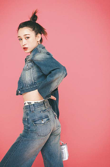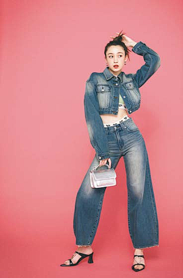 上半身以短版款式,搭配腰部反褶设计的牛仔裤,可展现腹部线条。