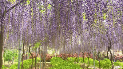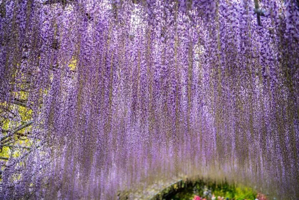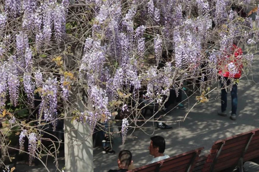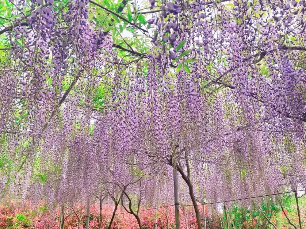 高大的紫藤棚架下,是成片的紫藤花,无数条紫藤花枝条从空中垂落,仿佛一串串紫色的小铃铛汇聚而成的“紫藤花瀑布”。