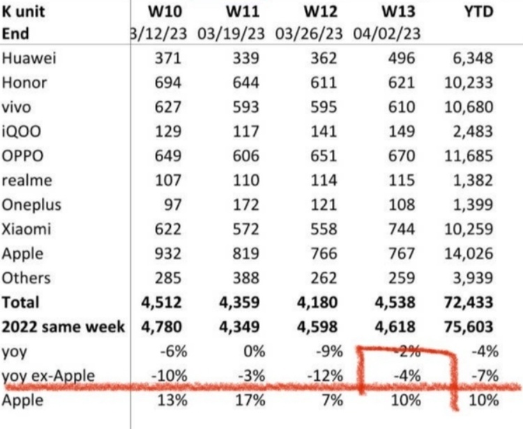 市场调研机构IDC的数据显示,2022年全年,中国智能手机市场出货量约2.86亿台,同比下降幅度13.2%,这是中国智能手机市场有史以来最大降幅。而截止2023年4月2日,第13周智能手机市场销量报告表明,中国手机市场非但没有实现复苏,反而继续下跌了约2%,当周合计销量大约为453.8万部。