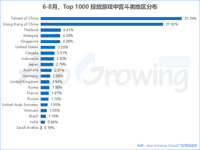 中文版游戏于2017年上线,2018开始陆续发行多语言版本, 游戏已运营相当一段的时间,从畅销榜单可见目前的游戏重点营运区域。 以Google Play近一个月畅销榜为例, 港台、越南、泰国保持在Top 20,韩版排到Top 30, 日版排到Top 100, 俄语版,英文版地区近一个月掉出前100,曾经最高进入Top 20 。据App Growing Global 记录到近3个月投放语言版本的广告数占比如下: