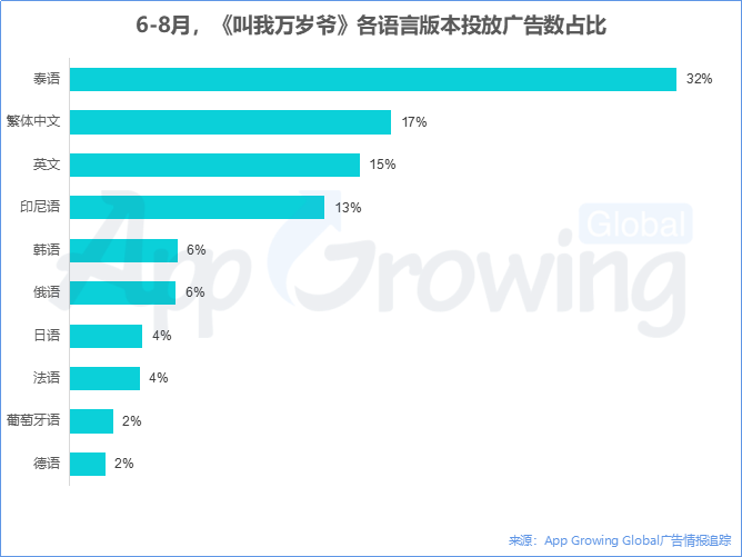 近一个月Google Play畅销榜分类排名,泰国保持在Top 20;港台,马来西亚, 新加坡,韩版保持在Top 50 ;日版,印尼版在Top100内,惊喜的是, 产品在德国,法国,意大利, 巴西近一个月也保持在Top 100以内。据App Growing Global 记录到近3个月投放语言版本的广告数占比如下: