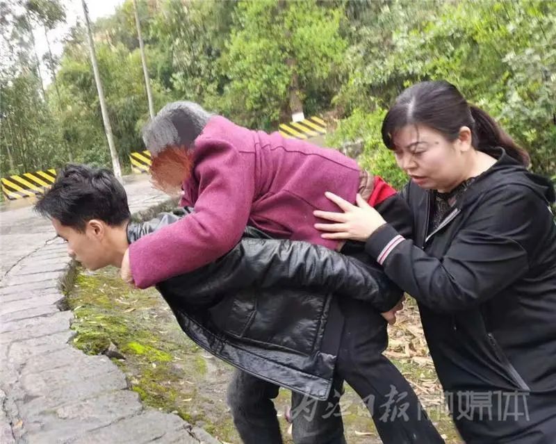 此时雨越下越大,与医院取得联系后,救护车需20分钟才能到达现场。刘杨认为老人受伤不适合长时间淋雨,便将老人背起来走了10几米远的距离,将老人送上同行家人的另一辆车,并叮嘱由这辆车载老人去医院。