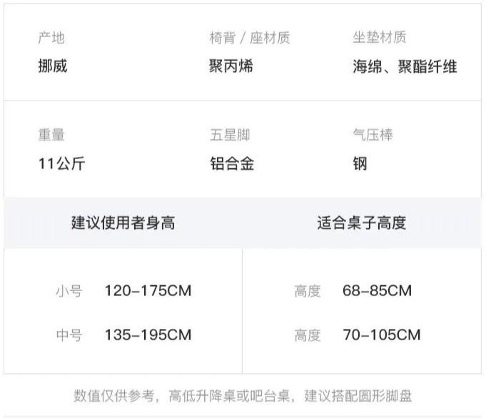 这款椅子分小号和中号,高度都是可以灵活调节的。小号可以兼容120-175cm的身高,孩子和一般身高的大人都够用了;如果担心孩子个头蹿的快,或者大人身高略高一些,可以选择中号,可以兼容135-195cm的身高。