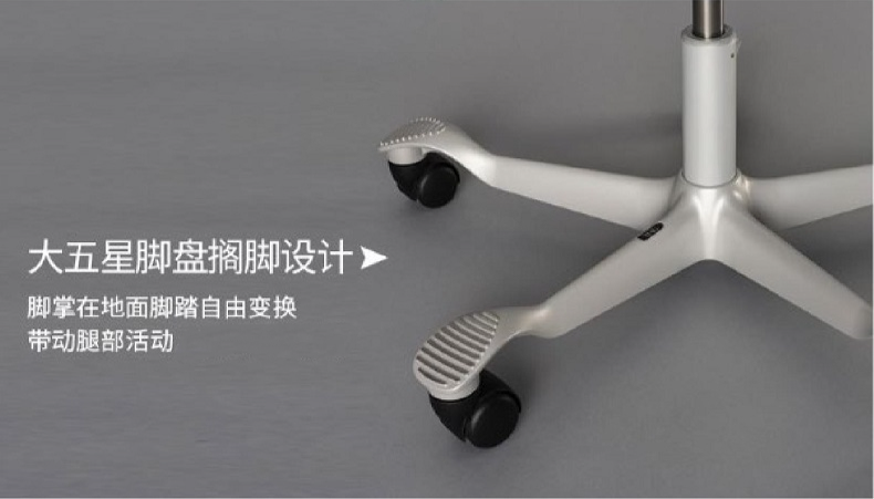 底部有一个直径73cm的超大五星脚盘,上有防滑脚踏,可以不用再额外搭配脚凳,脚掌可在地面和脚踏上自由变换搁踏,带动下肢活动,轻松着力。