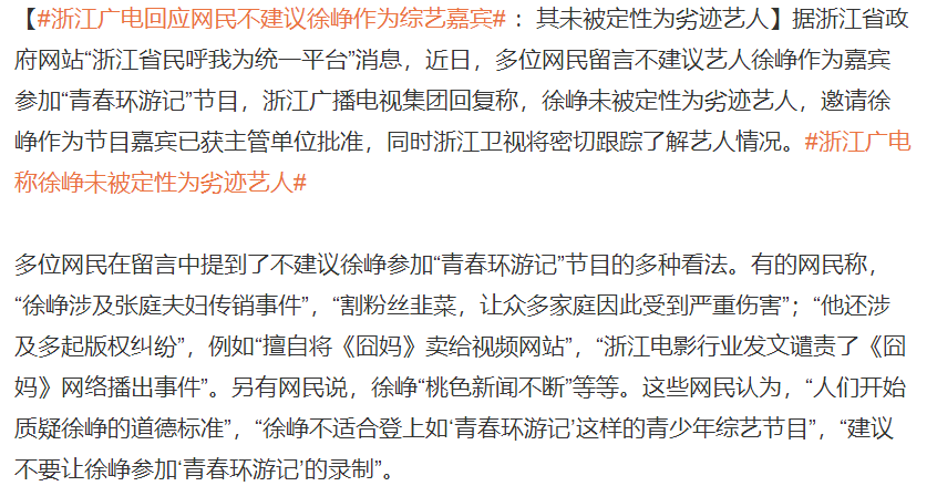 随后,浙江广播电视集团发布声明:「徐峥未被定性劣迹艺人,邀请徐峥作为节目嘉宾已获主管部门批准。」