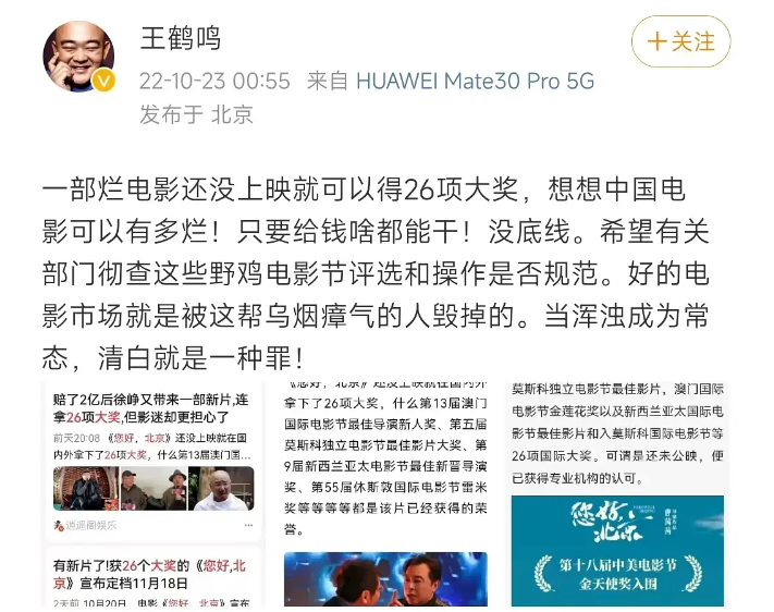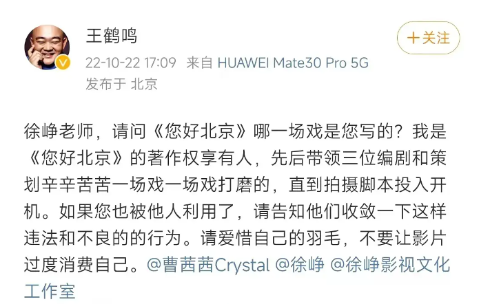 2022年10月22日,演员王鹤鸣在网上吐槽徐峥一个字没写,就当上《您好,北京》这部电影的编剧。