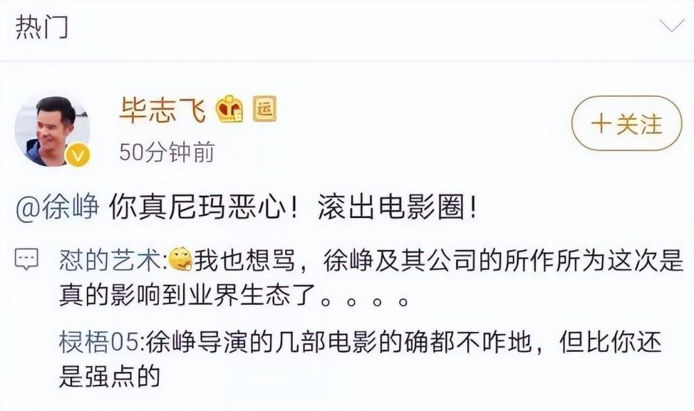 毕志飞在网上喊话让徐峥滚出娱乐圈。或许中了因果,拍摄完《囧妈》后,徐峥遭到同行群起嘲讽。