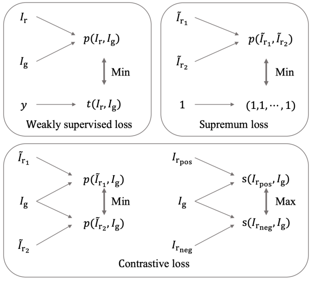 损失函数的设计上考虑了三个方面:1)弱监督损失,用于拟合输入参考图像 & 生成图像对及其对应的质量标签;2)无监督对比学习损失,用于捕捉参考图像和生成图像风格相似度;3)上界损失,用于学到来自真实图像的两个增强图像的风格一致性。