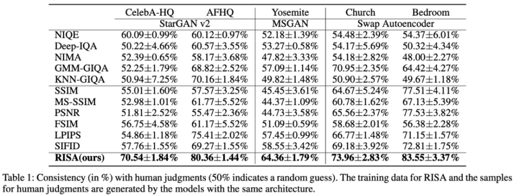 接着从量化指标的角度,文中进行了广泛的人工评价测试,以说明 RISA 评价结果和人的主观感受具有较高的一致性。具体来说,对于每个任务都选取了上千个三元组样本,包含一张参考图像和两张生成图像。两张生成图像可能来自于同一架构模型的两个不同训练阶段的中间模型,也可能来自于两个充分收敛的不同架构的模型。测试者被要求从二者中选出质量更好的一张。最终对于每个任务,保证了每组样本都有至少三个测试者参与评价,而所有评价均一致的样本被保留,用于评估 RISA 的评价与人的主观感受的一致性。