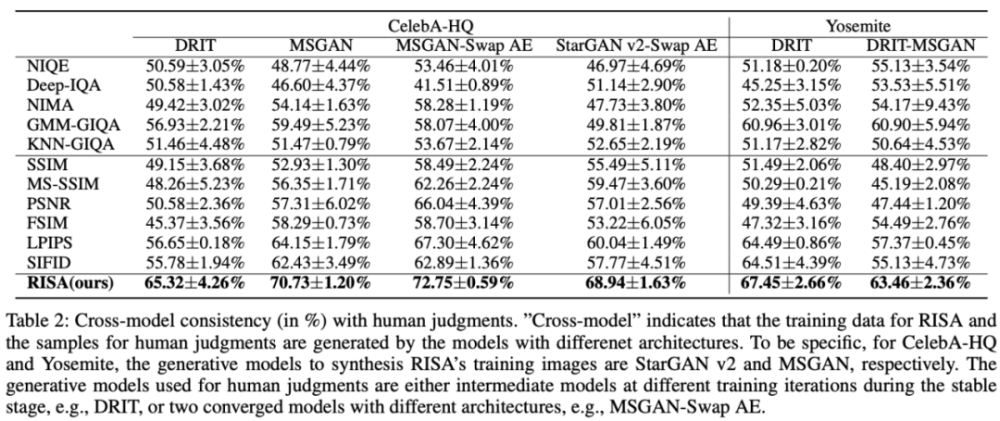 下表对应于 RISA 的训练数据和测试数据均由相同架构的模型生成的情况。可以看到 RISA 的评价结构能够与人的主观感受具有更高的一致性,且优于现有的主流的有参考和无参考单张图像质量评价方法。