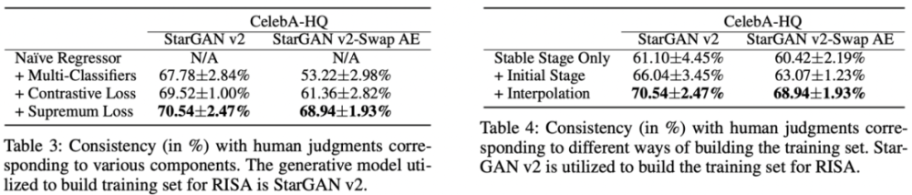 除图像空间的插值外,为了保证 RISA 的训练稳定,RISA 的预测使用的是个二值分类器(multiple binary classifers)输出取平均的形式,而没有采用简单的回归器输出拟合值。其中第个二值分类器用于预测当前生成图像质量大于一个特定阈值的概率。实验表明,将质量评估从回归问题转化为分类问题,能够显著地提升 RISA 的性能。