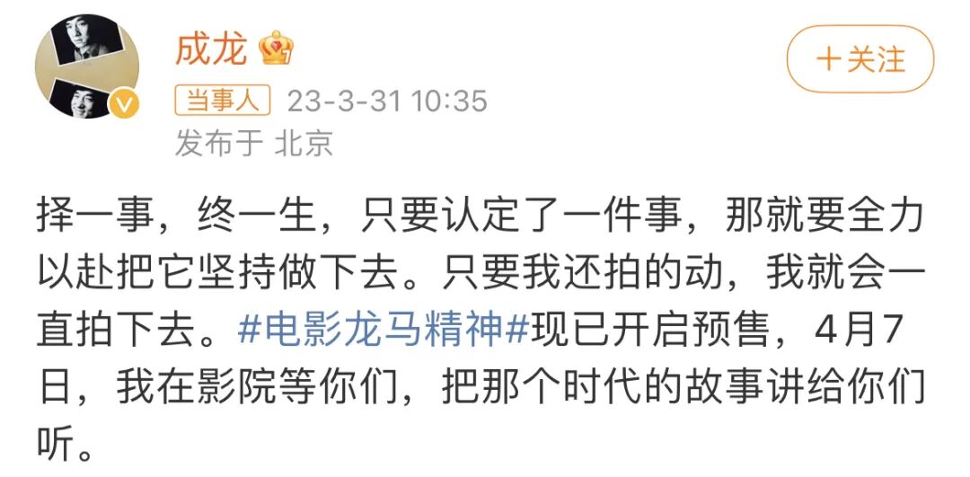 2023年4月7日,由杨子(《宠爱》)编剧、执导,成龙、刘浩存、郭麒麟领衔主演的动作喜剧《龙马精神》上映,这天也是大哥的69岁生日。