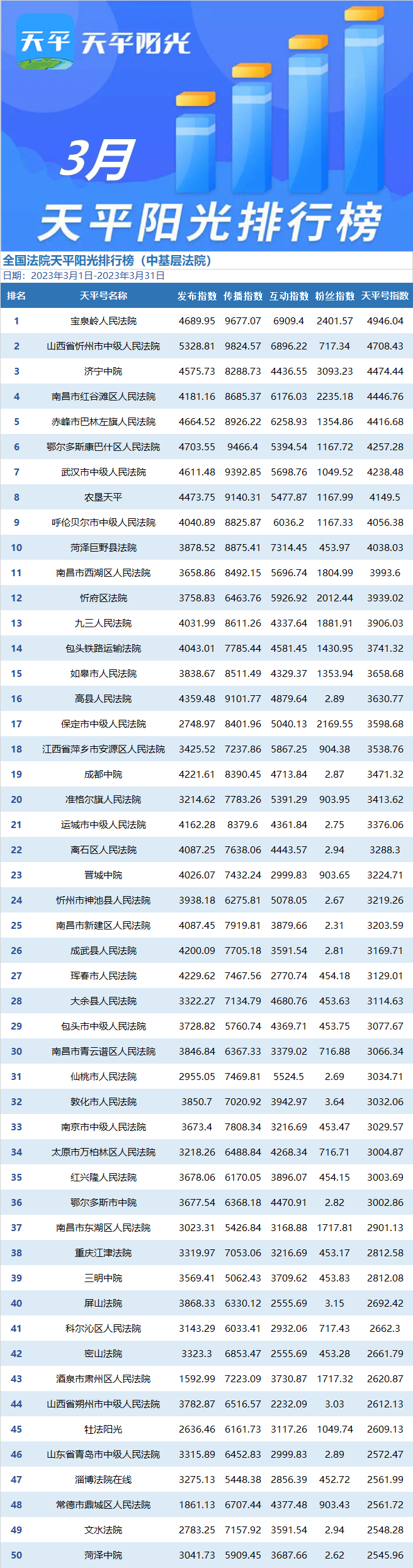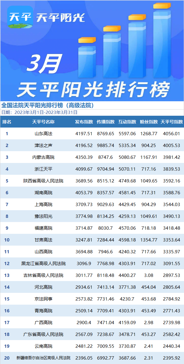 3月,“山东高法”进步三个名次,坐上状元宝座。“津法之声”发挥稳定,再夺榜眼。“内蒙古高院”进步两名,喜获探花,恭喜恭喜!